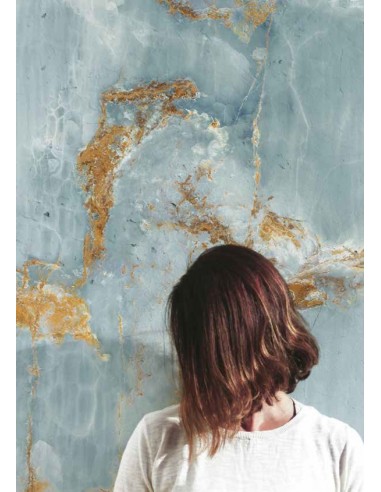 Ścienne i podłogowe płytki Imola Onyx Aqua Blue Gold Poler 60x120 to płytki inspirowane marmurem onyxowym. Kamień ten zbudowany jest z wapienia osadowego barwionego przez wodę źródlaną i infiltrację. Ten azjatycki minerał charakteryzuje się efektem przezroczystości co sprawia że doskonale nadaje się do pomieszczeń zaaranżowanych z nutą ekskluzywności.