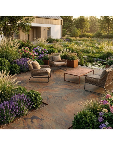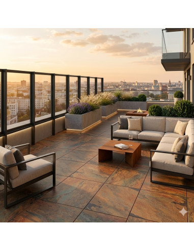 Jeśli zależy Ci na tarasie w stylu loftowym, nowoczesnym patio albo eleganckiej strefie wypoczynkowej o bardziej industrialnym charakterze, płyty tarasowe imitujące rdzę będą bardzo trafnym wyborem. Zoya Peacock Copper to model, który łączy dekoracyjny wygląd z parametrami potrzebnymi na zewnątrz.